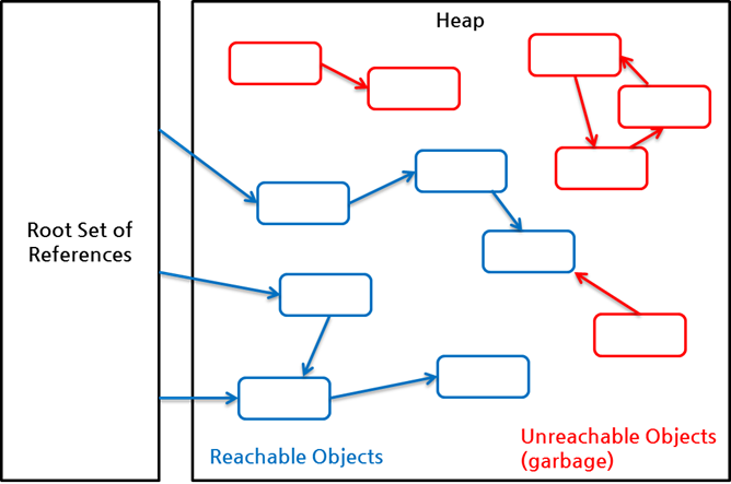 어떤 객체에 유효한 참조가 있으면 reachable, 없으면 unreachable로 구별하고 unreachable은 가비지로 간주해서 GC 수행한다. 한 객체는 여러 다른 객체를 참조하고, 참조된 다른 객체들도 마찬가지로 또다른 객체들을 참조할 수 있으므로 객체들은 참조 사슬을 이룬다. 이러한 상황에서 유효한 참조 여부를 파악하려면 항상 유효한 최초의 참조가 있어야 하는데 이른 객체 참조의 root set이라고 한다.